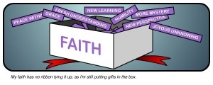 This cartoon is cool and helpful. Maybe if we regarded faith as a gift (rather than as something to be protected or tied up) as Jon over at ASBO Jesus is suggesting then our faith would continue to grow. A faith with no ribbons …. I like the sound of that because I want my faith to continue to deepen rather than allow me to box it away somewhere where it will get dusty.