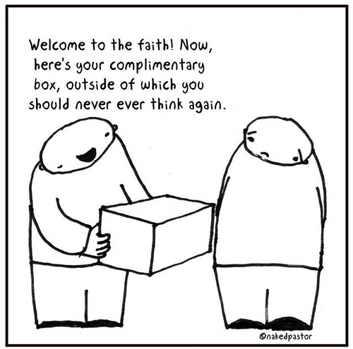 I found this cartoon this week on Naked Pastor. David, aka Naked Pastor, sums up a lot of my fears in his cartoons. This none in particular hits the nail on the head of what, to me, is wrong with a lot of what we call church. A number of people I seem to engage with during the week seem to have this image of church – an image where thinking is controlled.